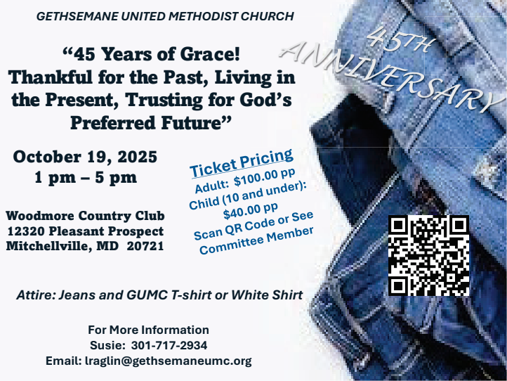 Don’t miss your chance to celebrate 45 incredible years of faith, fellowship, and service at Gethsemane UMC! Anniversary tickets will be available Sunday, July 27th, after the service. Secure your ticket early and be part of this joyful milestone event!