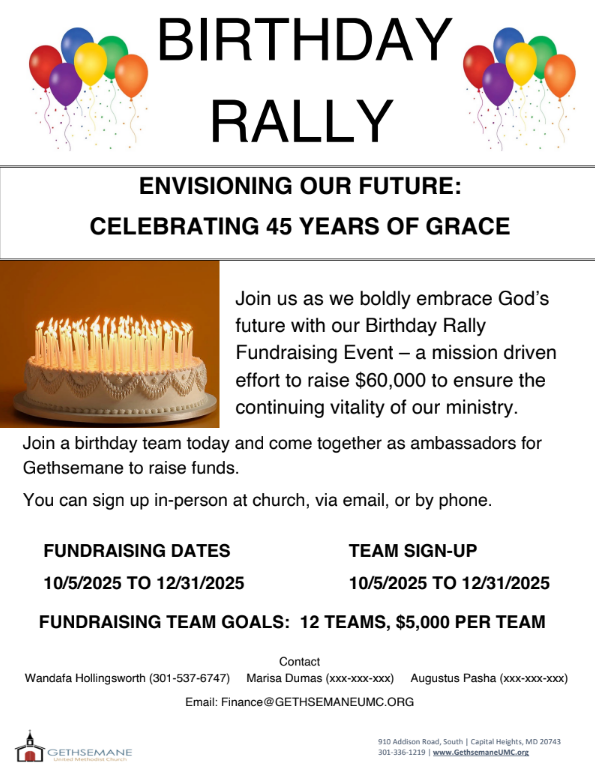 As shared during Sunday’s presentation, we are launching our Birthday Rally Fundraising Campaign — a joyful, church-wide effort to help ensure the continuing financial vitality of our ministry.