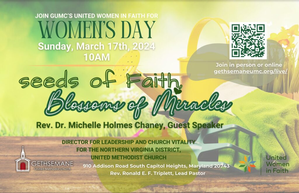 The United Women in Faith cordially invite you to celebrate Women’s Day 2024 on March 17th at 10am, themed “Seeds of Faith, Blossoms of Miracles.  Our guest speaker will be The Reverend Dr. Michelle Holmes Chaney.