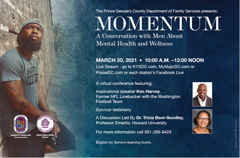 The Department of Family Services, Domestic Violence and Human Trafficking Division is thrilled to announce its continuation of the MoMENtum Men and Boys Conference Series; “MoMENtum: A Conversation with Men about Mental Health and Wellness.   This years’ conference will emphasize the importance of men’s mental health in creating healthy relationships. The conference will be held on KYSDC.com, MyMajicDC.com, PraiseDC.com and each station’s Facebook Live, on Saturday, March 20, 2021.  While we are disappointed we can’t be together, hosting the conference virtually offers a unique opportunity to share the awesome work being achieved in Prince George’s County with our family and friends.