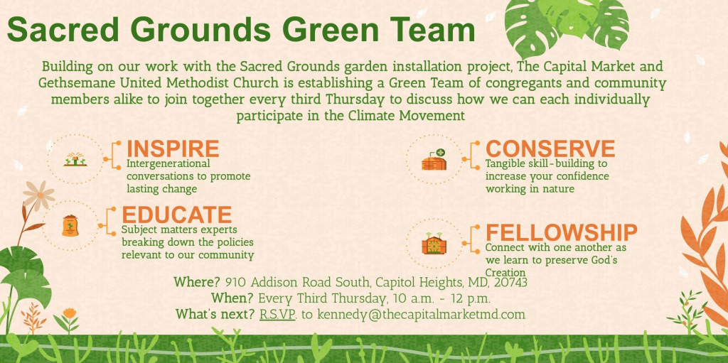 Building on the Sacred Grounds garden installation project, The Capital Market and Gethsemane United Methodist Church are coming together to launch the Sacred Grounds Green Team. The Green Team will converge as a gathering of congregants and community members committed to caring for God’s Creation and engaging in the climate movement.