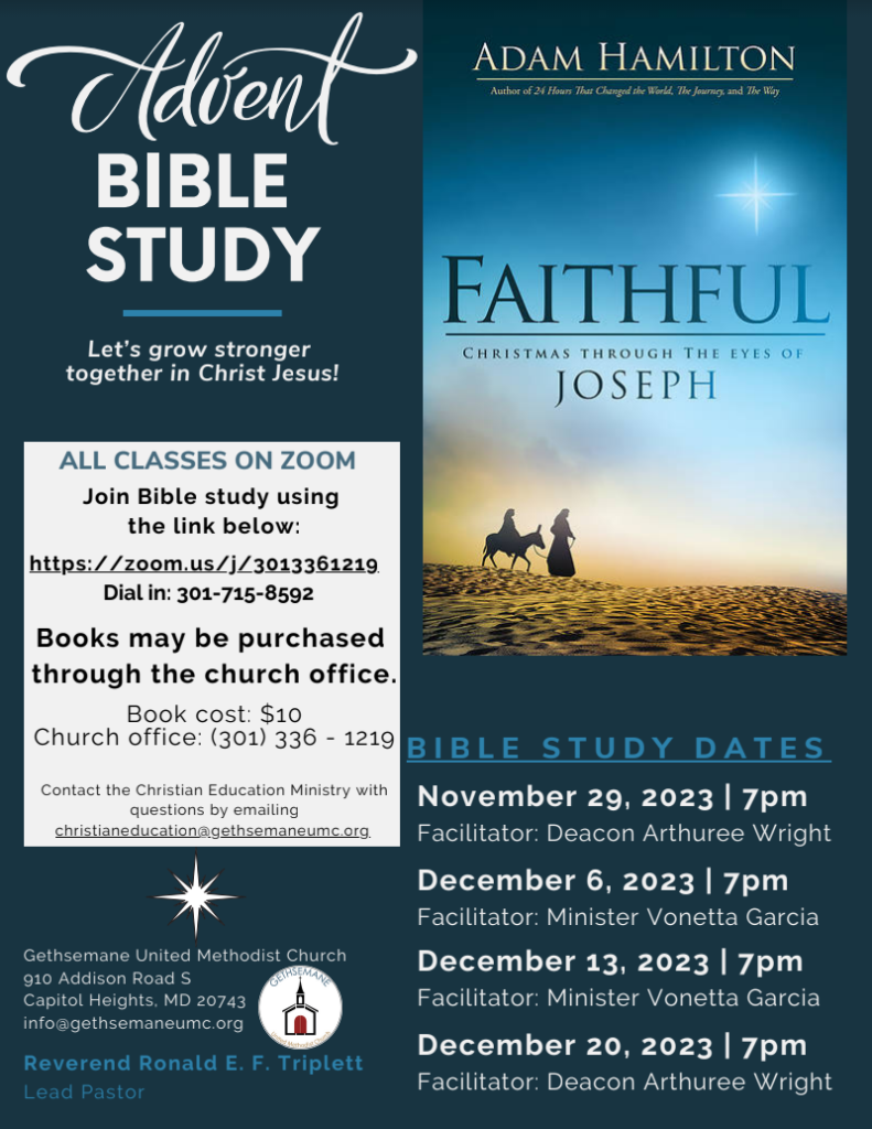 The name of the book that we’ll be using is Faithful, by Adam Hamilton and can be purchased for $10.00 by contacting the church’s office at 301-336-1219. The dates and facilitators are: